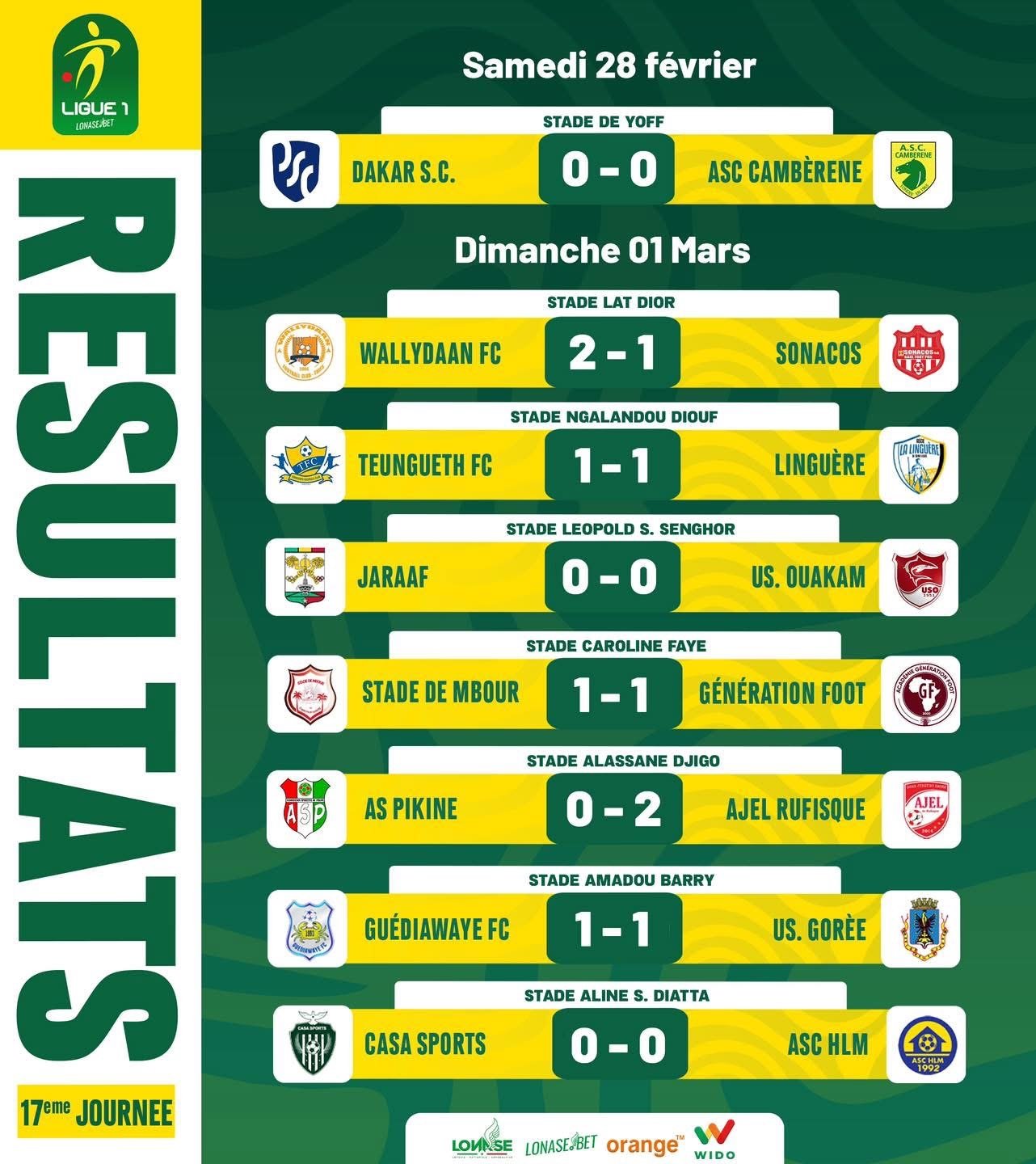 AJEL gagne pendant que Gorée traine le pas. Après la défaite la semaine dernière face à Teungueth FC (0-1), les Insulaires ont buté sur une solide équipe de Guédiawaye Football Club (1-1), qui lutte pour sa survie. Avec le même nombre de points que Teungueth FC (28), Gorée est désormais sous la menace des Rio Boys.