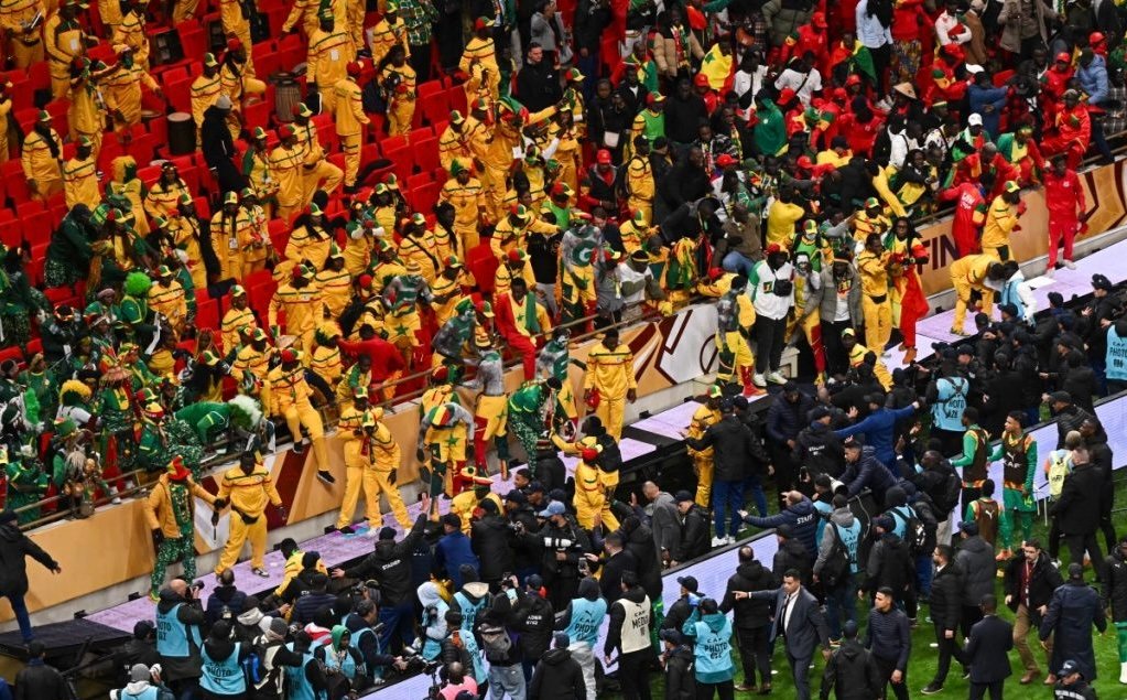 Lorsque l’arbitre congolais a sifflé le penalty pour le Maroc, les joueurs n’ont pas été les seuls à protester. Le 12e Gaïndé facilement identifiable avec ses couleurs du Sénégal, n’a pas pu se retenir face à l’injustice. Ils ont fait face aux forces de sécurité, pour témoigner leur mécontentement. 18 d’entre eux seront finalement arrêtés.
